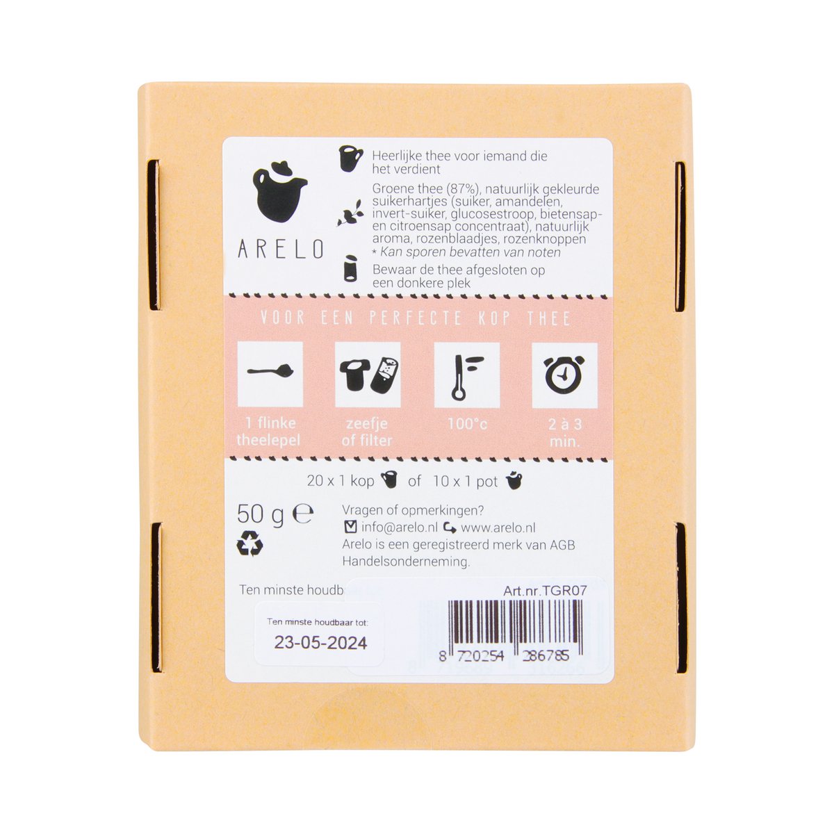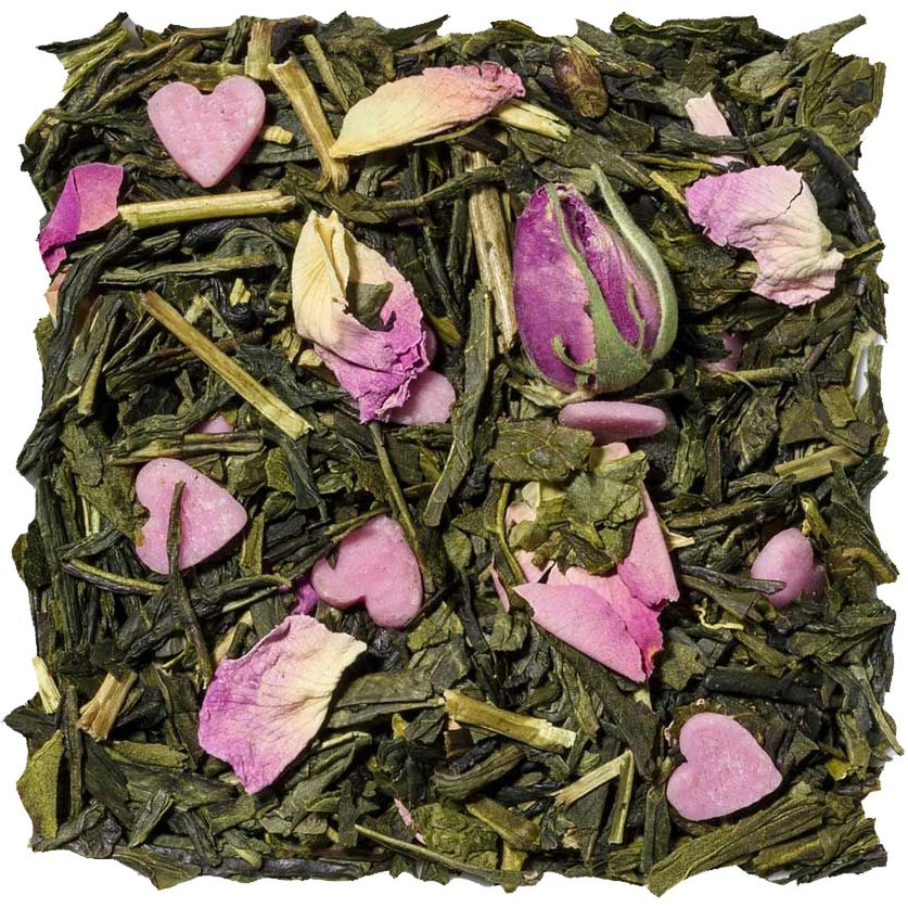 Groene thee (83%), natuurlijk gekleurde suikerhartjes (suiker, amandelen, invertsuiker, glucosestroop, bietensapextract, citroensap concentraat), rozenblaadjes, natuurlijk aroma, rozenknopjes