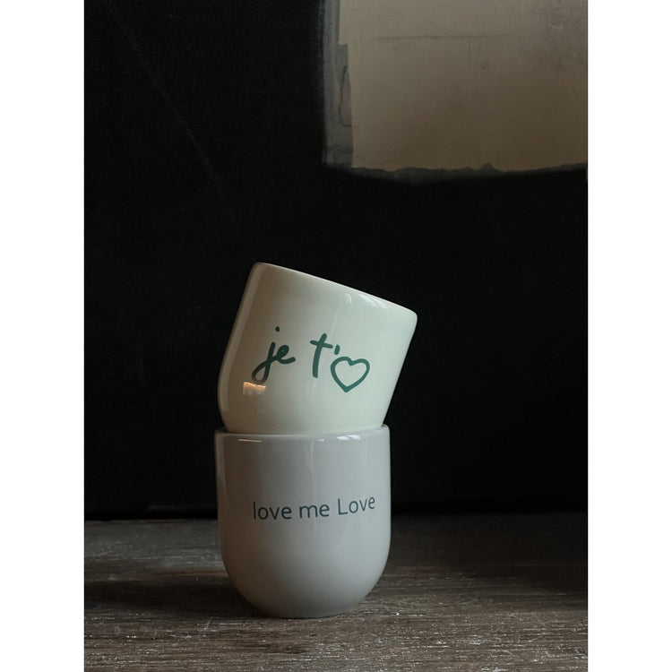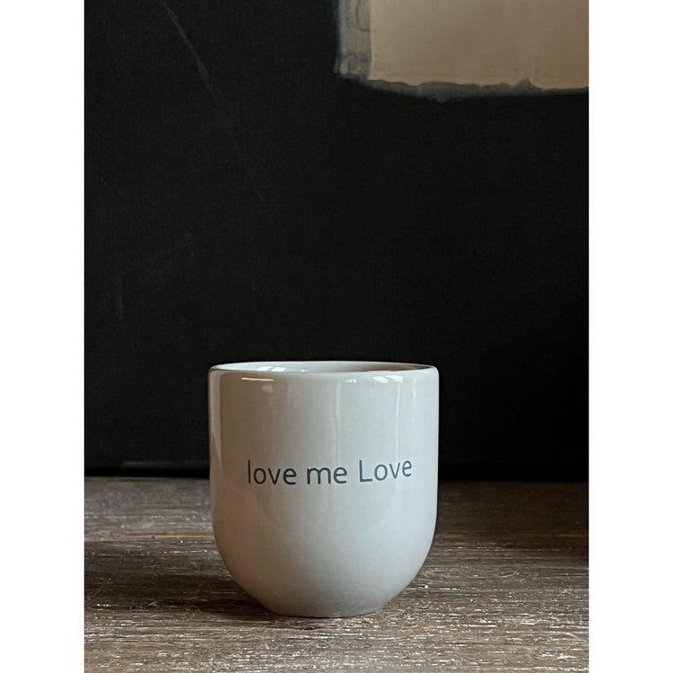 Sisi – Graublaue, glänzende Keramiktasse mit dem Text „Love me Love“, 2 cl Die Sisi-Tasse ist spülmaschinenfest. 8x8 cm, 2 dcl. Jeder Sisi-Becher ist handgefertigt, in Farbe getaucht und mit handaufgetragenen Schriftzügen versehen, keine zwei sind genau gleich. Aufgrund des handgefertigten Prozesses kann das Gewicht jeder Tasse leicht variieren, bis zu 10 %