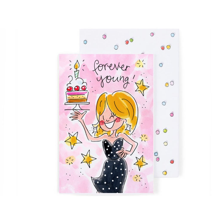 Natuurlijk wordt elke kaart geleverd met een bijpassende vrolijke envelop, zodat je jouw wens stijlvol én compleet kunt versturen. Het herkenbare, handgetekende Blond Amsterdam-design zorgt direct voor een lach op het gezicht van de ontvanger.