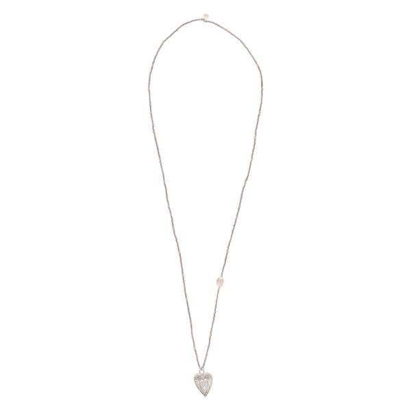 Dit is de Passionate Rozenkwarts Zilverkleurige Ketting van A Beautiful Story. Deze betekenisvolle ketting is handgemaakt van glaskralen. Aan de ketting hangt een vintage hart symbool van verzilverd messing en een rozenkwarts edelsteen. Deze ketting heeft een lengte van 74 centimeter.